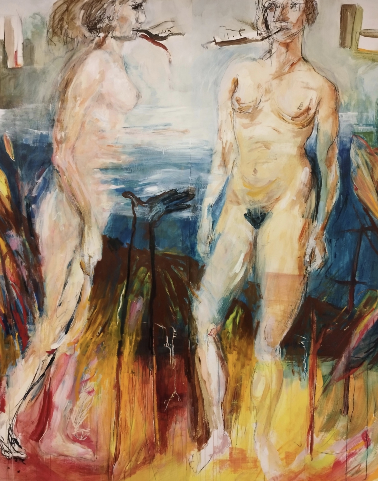 Je peins fougueusement, portée par une gestuelle tournoyante qui engage tout mon corps. Mes œuvres sont monumentales, souvent deux mètres de haut. Cette dimension transforme chaque création en véritable danse, où le pinceau devient le prolongement de mon être. Mes personnages habitent un lieu mystique, empreint de lumière et de puissance chromatique.